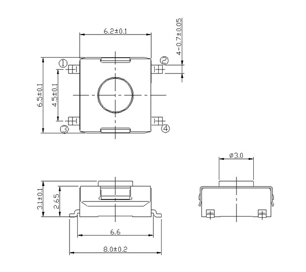 尺寸: 6.2X6.2mm 產品分類: 輕觸開關 - E系列 / 6.2x6.2 應用 ※ 各種電子設備像音響設備,辦公設備,通訊設備,測試儀器,電視機,錄像機,汽車等 特點 ※ 回流可焊 ※ 可做防靜電接地腳 ※ 用16mm寬的印花編帶包裝 ※ 用于高速SMT處理
