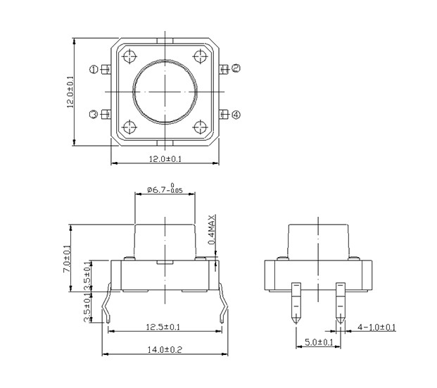 尺寸: 12.0X12.0mm 產品分類: 輕觸開關 - G系列 / 12x12 應用 ※ 各種電子設備像音響設備,辦公設備,通訊設備,測試儀器,電視機,錄像機,汽車等 特點 ※ 插腳類型,可以直接安在PCB上 ※ 一些輸出腳可以做為引腳讓電路設計更簡單 ※ 標準的帽子是可以做的