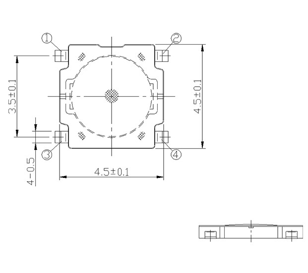 尺寸: 4.5x4.5mm 產品分類: 輕觸開關 - C系列 / 5.2, 4.5, 4.8 應用 ※ 用于操作各種像手機,通訊設備之類的設備 ※ 錄像機,相機,音頻設備 ※ 低面和輕量級的設計 特點 ※ 4.5x4.5x0.5mm尺寸圖,適用于高密度安裝 ※ 回流可焊 ※ 用12mm寬的編帶包裝