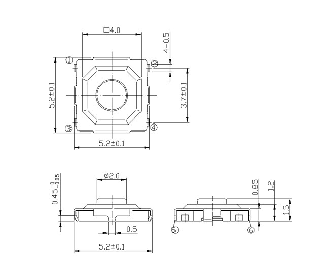 尺寸: 5.2X5.2mm 產品分類: 輕觸開關 - C系列 / 5.2, 4.5, 4.8 應用 ※ 用于操作各種像音響之類的電子設備 ※ 錄像機,通訊設備,相機,汽車等 ※ 家電等 特點 ※ 5.2x5.2尺寸圖,適用于高密度安裝 ※ 可以帶接地用于靜電釋放 ※ 觸點封裝結構使開關可靠性更高 ※ 回流可焊 ※ 用12mm寬的編帶包裝