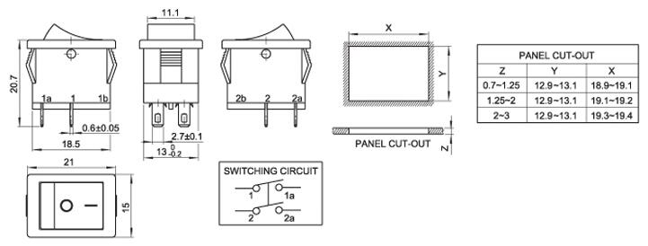 15*21 船型開(kāi)關(guān) 蹺板開(kāi)關(guān) IO電源開(kāi)關(guān) 1.額定工作電壓、電流Rating 3A/6A/15A 250V 2.使用溫度范圍Temperature -25+85℃ 3.接觸電阻Contact Resistance <0.03Ω 4.動(dòng)作力Actuating Force 1.3+0.5N 5.絕緣電阻Insulation Resistance >100MΩ 6.壽命(switching Life) 10000次