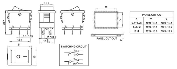15*21 船型開關 蹺板開關 IO電源開關 1.額定工作電壓、電流Rating 3A/6A/15A 250V 2.使用溫度范圍Temperature -25+85℃ 3.接觸電阻Contact Resistance <0.03Ω 4.動作力Actuating Force 1.3+0.5N 5.絕緣電阻Insulation Resistance >100MΩ 6.壽命(switching Life) 10000次