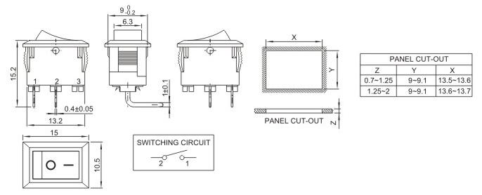 10*15 船型開關 蹺板開關 IO電源開關 1.額定工作電壓、電流Rating 3A/6A/15A 250V 2.使用溫度范圍Temperature -25+85℃ 3.接觸電阻Contact Resistance <0.03Ω 4.動作力Actuating Force 1.3+0.5N 5.絕緣電阻Insulation Resistance >100MΩ 6.壽命(switching Life) 10000次