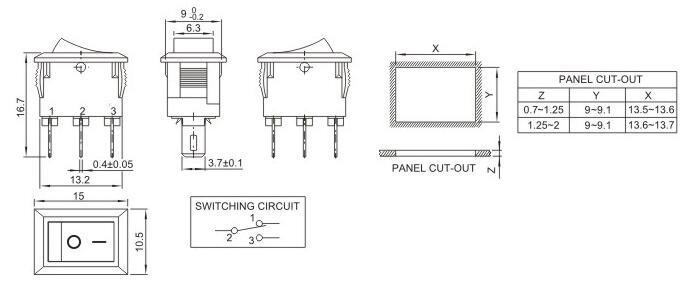 10*15 船型開關 蹺板開關 IO電源開關 1.額定工作電壓、電流Rating 3A/6A/15A 250V 2.使用溫度范圍Temperature -25+85℃ 3.接觸電阻Contact Resistance <0.03Ω 4.動作力Actuating Force 1.3+0.5N 5.絕緣電阻Insulation Resistance >100MΩ 6.壽命(switching Life) 10000次