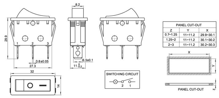 14*32 紅色帶燈 船型開關 蹺板開關 IO電源開關 1.額定工作電壓、電流Rating 3A/6A/15A 250V 2.使用溫度范圍Temperature -25+85℃ 3.接觸電阻Contact Resistance <0.03Ω 4.動作力Actuating Force 1.3+0.5N 5.絕緣電阻Insulation Resistance >100MΩ 6.壽命(switching Life) 10000次
