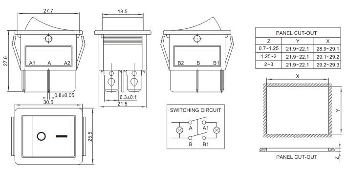 25*30.5紅色帶燈 船型開關(guān) 蹺板開關(guān) IO電源開關(guān) 1.額定工作電壓、電流Rating 3A/6A/15A 250V 2.使用溫度范圍Temperature -25+85℃ 3.接觸電阻Contact Resistance <0.03Ω 4.動作力Actuating Force 1.3+0.5N 5.絕緣電阻Insulation Resistance >100MΩ 6.壽命(switching Life) 10000次