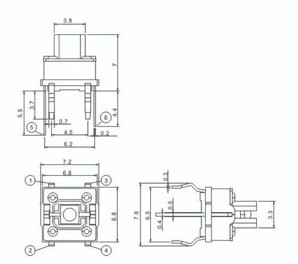 特長 ◆ 可用按入式直接安裝到線路板。 ◆ 輸出端子的一部分可作為跨接引線使用,電路設計簡單。 ◆ 標準按鈕可選。