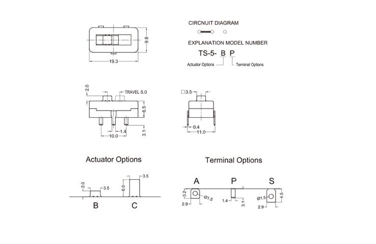 工作溫度范圍Operating temperature range:-30℃ to+85℃ 額定電流Rating:3A 250V AC 絕緣電阻Insulation resistance: 100MΩ min.500V DC 接觸電阻Contact resistance: 30m Ω max. 操作力度Operating fore:250±100gf 壽命Life time:10000 cycles(依產品而定)